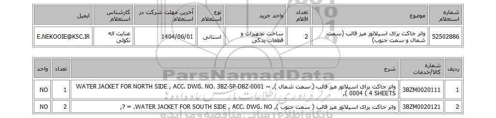 استعلام واتر جاکت برای اسیلاتور میز قالب (سمت شمال و سمت جنوب), استعلام واتر جاکت برای اسیلاتور میز قالب (سمت شمال و سمت جنوب)