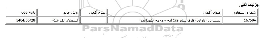 | 167504 | بست پایه دار لوله فلزی سایز 1/2 اینچ - دو پیچ نگهدارنده | استعلام الکترونیکی | 1404/05/28 |