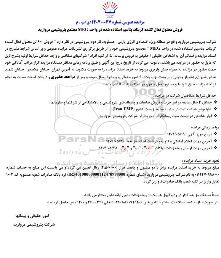 شرکت پتروشیمی مروارید واقع در منطقه ویژه اقتصادی انرژی پارس- عسلویه، فاز دوم پتروشیمی در نظر دارد " فروش 600 تن محلول فعال کننده کربنات پتاسیم استفاده شده در واحد MEG " مجتمع پتروشیمی خود را از طریق برگزاری تشریفات مزایده عمومی و براساس شرایط مندرج در اسناد مزایده و ضمائم آن به اشخاص حقیقی / حقوقی به فروش برساند. از کلیه افراد / شرکتهای متقاضی و واجد حداقل شرایط اولیه بشرح ذیل که مایل به حضور در مزایده می باشند، دعوت می گردد از تاریخ درج این آگهی و طبق برنامه زمانی مدنظر دستگاه مزایده گزار مراتب آمادگی خود جهت حضور در مزایده به همراه فیش واریزی مربوط به خرید اسناد مزایده را به صورت مکتوب به آدرس تهران، خیابان ملاصدرا، خیابان شهید عباس شیرازی (شیراز جنوبی)، بن بست بهار، پلاک 6، امور حقوقی و پیمانها ارسال نموده و پس از مراجعه حضوری و دریافت اسناد، نسبت به انجام فرآیند مزایده طبق شرایط و دستورالعمل مندرج در اسناد مزایده اقدام نمایند.