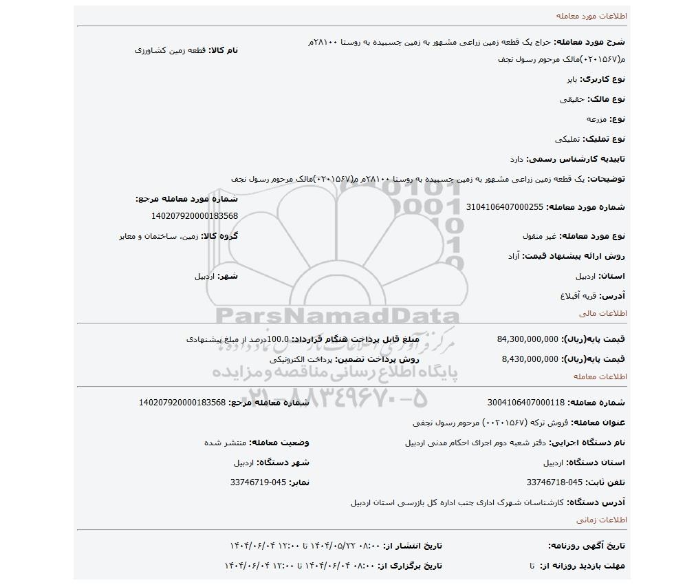 شرح مورد معامله: حراج یک قطعه زمین زراعی مشهور به زمین چسبیده به روستا ۲۸۱۰۰م م(۰۲۰۱۵۶۷)مالک مرحوم رسول نجفنام کالا: قطعه زمین کشاورزی