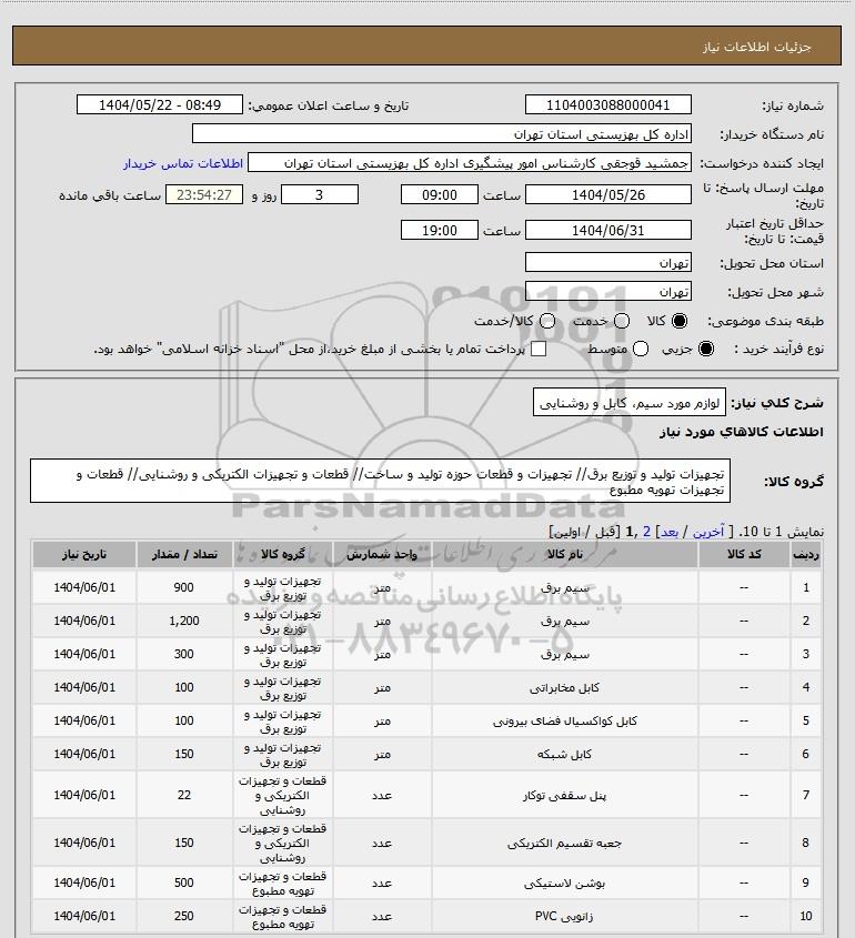 | 4 | -- | کابل مخابراتی | متر | تجهیزات تولید و توزیع برق | 100 | 1404/06/01 |