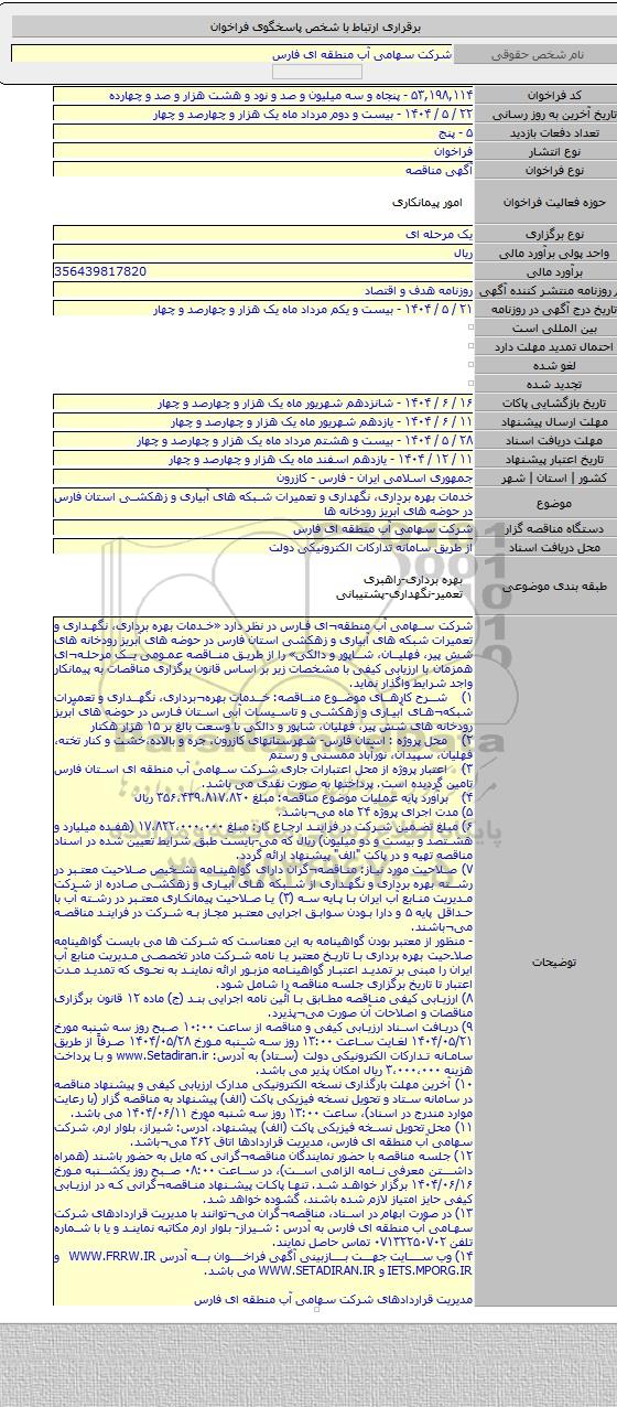 ۱) شرح کارهای موضوع مناقصه: خدمات بهره¬برداری، نگهداری و تعمیرات شبکه¬های آبیاری و زهکشی و تاسیسات آبی استان فارس در حوضه های آبریز رودخانه های شش پیر، فهلیان، شاپور و دالکی با وسعت بالغ بر ۱۵ هزار هکتار ۲) محل پروژه : استان فارس- شهرستانهای کازرون، جره و بالاده،خشت و کنار تخته، فهلیان، سپیدان، نورآباد ممسنی و رستم ۳) اعتبار پروژه از محل اعتبارات جاری شرکت سهامی آب منطقه ای استان فارس تامین گردیده است. پرداختها به صورت نقدی می باشد. ۴) برآورد پایه عملیات موضوع مناقصه: مبلغ ۳۵۶،۴۳۹،۸۱۷،۸۲۰ ریال ۵) مدت اجرای پروژه ۲۴ ماه می¬باشد. ۶) مبلغ تضمین شرکت در فرایند ارجاع کار: مبلغ ۱۷،۸۲۲،۰۰۰،۰۰۰ (هفده میلیارد و هشتصد و بیست و دو میلیون) ریال که می-بایست طبق شرایط تعیین شده در اسناد مناقصه تهیه و در پاکت "الف" پیشنهاد ارائه گردد. ۷) صلاحیت مورد نیاز: مناقصه¬گران دارای گواهینامه تشخیص صلاحیت معتبر در رشته بهره برداری و نگهداری از شبکه های آبیاری و زهکشی صادره از شرکت مدیریت منابع آب ایران با پایه سه (۳) یا صلاحیت پیمانکاری معتبر در رشته آب با حداقل پایه ۵ و دارا بودن سوابق اجرایی معتبر مجاز به شرکت در فرایند مناقصه می¬باشند. - منظور از معتبر بودن گواهینامه به این معناست که شرکت ها می بایست گواهینامه صلاحیت بهره برداری با تاریخ معتبر یا نامه شرکت مادر تخصصی مدیریت منابع آب ایران را مبنی بر تمدید اعتبار گواهینامه مزبور ارائه نمایند به نحوی که تمدید مدت اعتبار تا تاریخ برگزاری جلسه مناقصه را شامل شود. ۸) ارزیابی کیفی مناقصه مطابق با آئین نامه اجرایی بند (ج) ماده ۱۲ قانون برگزاری مناقصات و اصلاحات آن صورت می¬پذیرد. ۹) دریافت اسناد ارزیابی کیفی و مناقصه از ساعت ۱۰:۰۰ صبح روز سه شنبه مورخ ۱۴۰۴/۰۵/۲۱ لغایت ساعت ۱۳:۰۰ روز سه شنبه مورخ ۱۴۰۴/۰۵/۲۸ صرفاً از طریق سامانه تدارکات الکترونیکی دولت (ستاد) به آدرس: www.Setadiran.ir و با پرداخت هزینه ۳،۰۰۰،۰۰۰ ریال امکان پذیر می باشد. ۱۰) آخرین مهلت بارگذاری نسخه الکترونیکی مدارک ارزیابی کیفی و پیشنهاد مناقصه در سامانه ستاد و تحویل نسخه فیزیکی پاکت (الف) پیشنهاد به مناقصه گزار (با رعایت موارد مندرج در اسناد)، ساعت ۱۳:۰۰ روز سه شنبه مورخ ۱۴۰۴/۰۶/۱۱ می باشد. ۱۱) محل تحویل نسخه فیزیکی پاکت (الف) پیشنهاد، آدرس: شیراز، بلوار ارم، شرکت سهامی آب منطقه ای فارس، مدیریت قراردادها اتاق ۳۶۲ می¬باشد. ۱۲) جلسه مناقصه با حضور نمایندگان مناقصه¬گرانی که مایل به حضور باشند (همراه داشتن معرفی نامه الزامی است)، در ساعت ۰۸:۰۰ صبح روز یکشنبه مورخ ۱۴۰۴/۰۶/۱۶ برگزار خواهد شد. تنها پاکات پیشنهاد مناقصه¬گرانی که در ارزیابی کیفی حایز امتیاز لازم شده باشند، گشوده خواهد شد. ۱۳) در صورت ابهام در اسناد، مناقصه¬گران می¬توانند با مدیریت قراردادهای شرکت سهامی آب منطقه ای فارس به آدرس : شیراز- بلوار ارم مکاتبه نمایند و یا با شماره تلفن ۰۷۱۳۲۲۵۰۷۰۲ تماس حاصل نمایند. ۱۴) وب سایت جهت بازبینی آگهی فراخوان به آدرس WWW.FRRW.IR و IETS.MPORG.IR و WWW.SETADIRAN.IR می باشد. مدیریت قراردادهای شرکت سهامی آب منطقه ای فارس |
