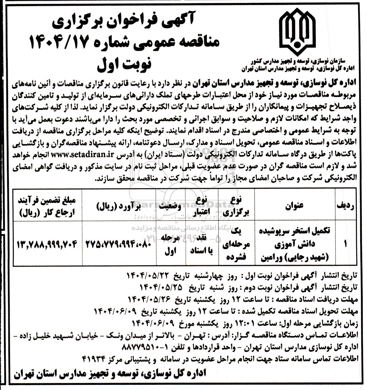 | 1 | تکمیل استخر سرپوشیده دانش آموزی (شهید رجایی) ورامین | یک مرحله ای فشرده | نقد یا اسناد | مرحله اول | 275.779.994.080 | 13.788.999.704 |