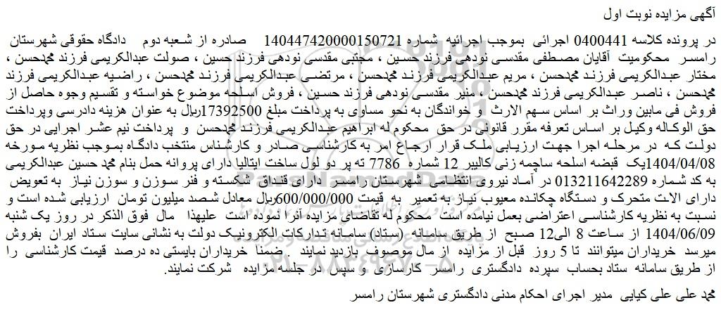 در پرونده کلاسه 0400441 اجرائی بموجب اجرائیه شماره 140447420000150721 صادره از شعبه دوم دادگاه حقوقی شهرستان رامسر محکومیت آقایان مصطفی مقدسی نودهی فرزند حسین ، مجتبی مقدسی نودهی فرزند حسین ، صولت عبدالکریمی فرزند محمدحسن ، مختار عبدالکریمی فرزند محمدحسن ، مریم عبدالکریمی فرزند محمدحسن ، مرتضی عبدالکریمی فرزند محمدحسن ، راضیه عبدالکریمی فرزند محمدحسن ، ناصر عبدالکریمی فرزند محمدحسن ، منیر مقدسی نودهی فرزند حسین ، فروش اسلحه موضوع خواسته و تقسیم وجوه حاصل از فروش فی مابین وراث بر اساس سهم الارث و خواندگان به نحو مساوی به پرداخت مبلغ 17392500ریال به عنوان هزینه دادرسی وپرداخت حق الوکاله وکیل بر اساس تعرفه مقرر قانونی در حق محکوم له ابراهیم عبدالکریمی فرزند محمدحسن و پرداخت نیم عشر اجرایی در حق دولت که در مرحله اجرا جهت ارزیابی ملک قرار ارجاع امر به کارشناسی صادر و کارشناس منتخب دادگاه بموجب نظریه مورخه 1404/04/08یک قبضه اسلحه ساچمه زنی کالیبر 12 شماره 7786 ته پر دو لول ساخت ایتالیا دارای پروانه حمل بنام محمد حسین عبدالکریمی به کد شماره 013211642289 در آماد نیروی انتظامی شهرستان رامسر دارای قنداق شکسته و فنر سوزن و سوزن نیاز به تعویض دارای الات متحرک و دستگاه چکانده معیوب نیاز به تعمیر به قیمت 600/000/000ریال معادل شصد میلیون تومان ارزیابی شده است و نسبت به نظریه کارشناسی اعتراضی بعمل نیامده است محکوم له تقاضای مزایده آنرا نموده است علیهذا مال فوق الذکر در روز یک شنبه 1404/06/09 از ساعت 8 الی12 صبح از طریق سامانه (ستاد) سامانه تدارکات الکترونیک دولت به نشانی سایت ستاد ایران بفروش میرسد خریداران میتوانند تا 5 روز قبل از مزایده از مال موصوف بازدید نمایند . ضمنا خریداران بایستی ده درصد قیمت کارشناسی را از طریق سامانه ستاد بحساب سپرده دادگستری رامسر کارسازی و سپس در جلسه مزایده شرکت نمایند.