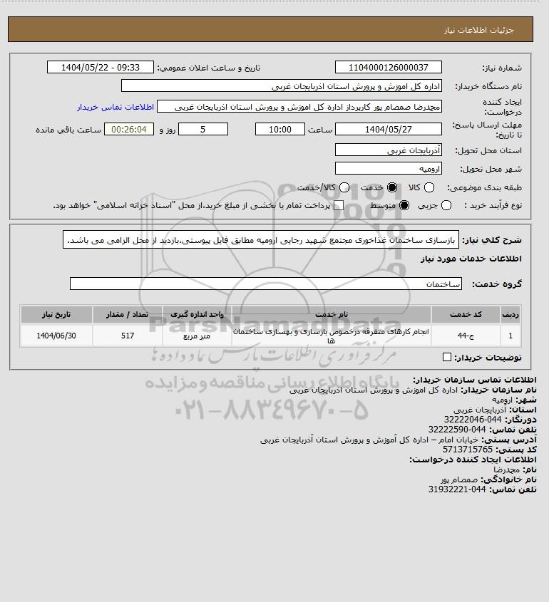 شرح کلی نیاز: بازسازی ساختمان غذاخوری مجتمع شهید رجایی ارومیه مطابق فایل پیوستی.بازدید از محل الزامی می باشد.
