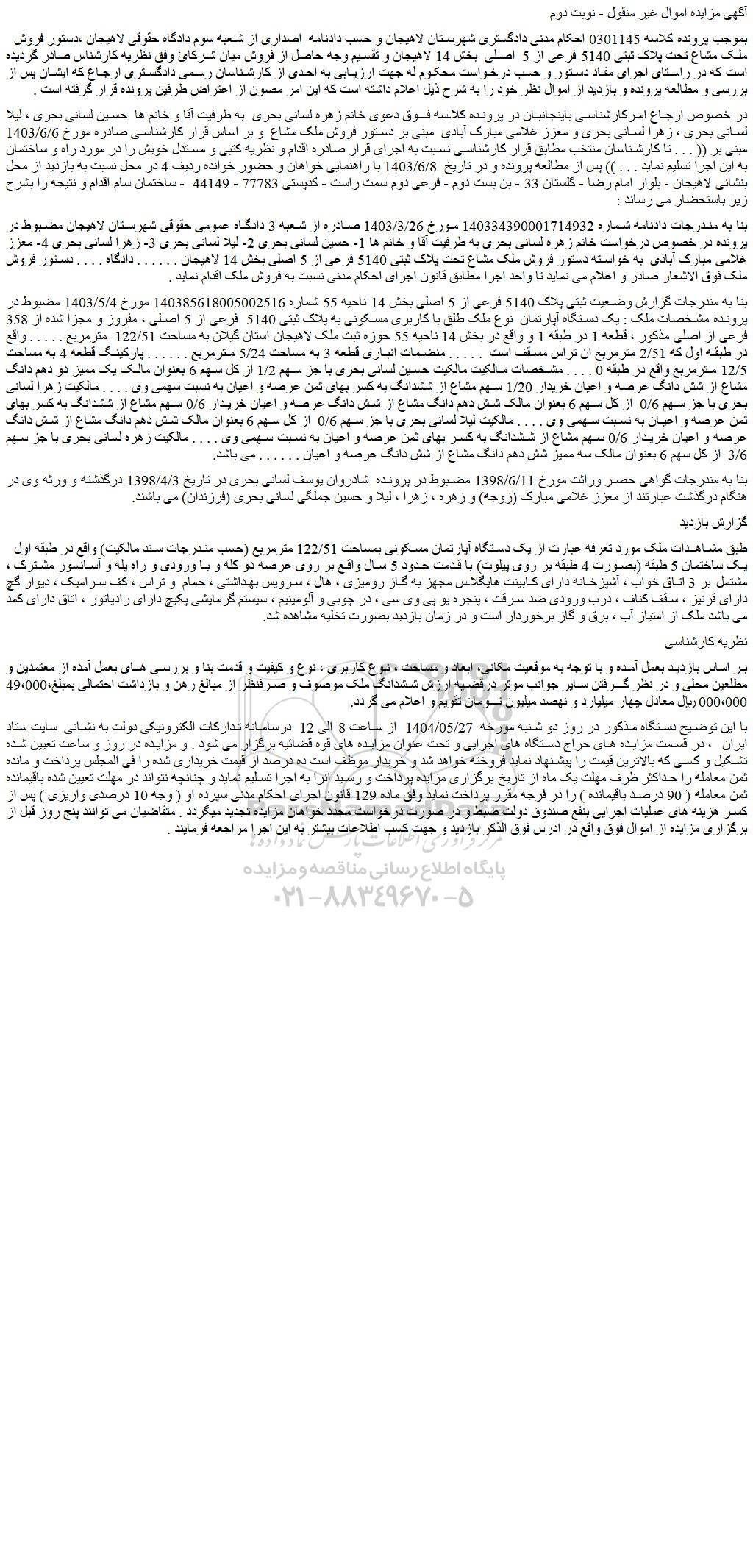 بموجب پرونده کلاسه 0301145 احکام مدنی دادگستری شهرستان لاهیجان و حسب دادنامه  اصداری از شعبه سوم دادگاه حقوقی لاهیجان ،دستور فروش ملک مشاع تحت پلاک ثبتی 5140 فرعی از 5  اصلی  بخش 14 لاهیجان و تقسیم وجه حاصل از فروش میان شرکائ وفق نظریه کارشناس صادر گردیده است که در راستای اجرای مفاد دستور و حسب درخواست محکوم له جهت ارزیابی به احدی از کارشناسان رسمی دادگستری ارجاع که ایشان پس از بررسی و مطالعه پرونده و بازدید از اموال نظر خود را به شرح ذیل اعلام داشته است که این امر مصون از اعتراض طرفین پرونده قرار گرفته است .