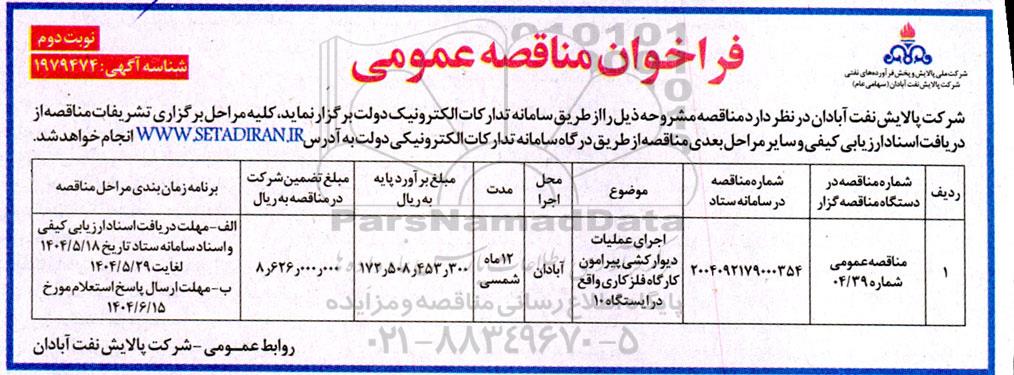 شرکت پالایش نفت آبادان در نظر دارد مناقصه مشروحه ذیل را از طریق سامانه تدارکات الکترونیک دولت برگزار نماید کلیه مراحل برگزاری تشریفات مناقصه از دریافت اسناد ارزیابی کیفی و سایر مراحل بعدی مناقصه از طریق درگاه سامانه تدارکات الکترونیکی دولت ستاد ایران انجام خواهد شد.