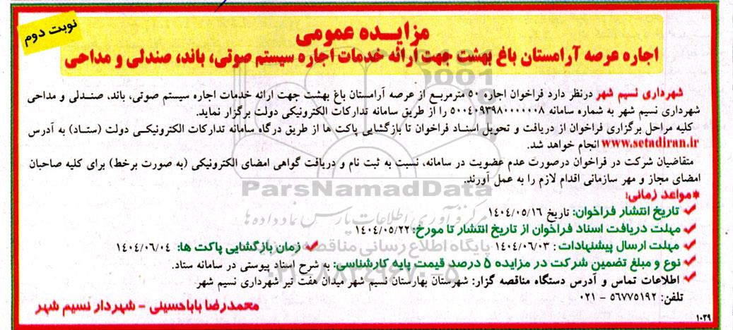 مزایده اجاره 50 متر مربع از محل آرامستان باغ بهشت جهت ارائه خدمات اجاره سیستم صوتی ، باند،؛ صندلی و مداحی  - نوبت دوم