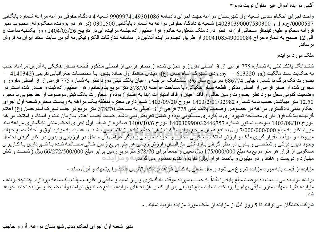واحد اجرای احکام مدنی شعبه اول شهرستان مراغه جهت اجرای دادنامه 9909974149301086 شعبه 4 دادگاه حقوقی مراغه مراغه شماره بایگانی 0000587/ج.م 1 و 140230390007530300 شعبه 4 دادگاه حقوقی مراغه به شماره بایگانی 0301500 (در هر دو پرونده محکوم له: محبوب منیر فرزانه محکوم علیه: محمدباقر سخائی فر) در نظر دارد ملک متعلق به خانم زهرا عظیم زاده جلسه مزایده ای در تاریخ 1404/05/26 روز یکشنبه ساعت 8 الی 12 صبح به شماره حراج 3004108549000084 از طریق انجام مزایده آنلاین در سامانه تدارکات الکترونیکی به آدرس سایت ستاد ایران به فروش برساند.