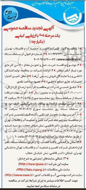 1- مناقصه گزار شرکت تامین و تصفیه آب و فاضلاب تهران به شناسه ملی 10102671221