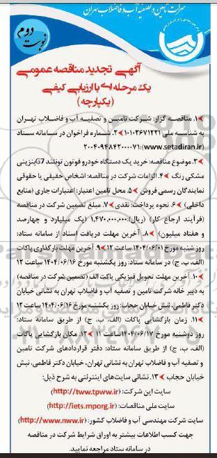 1- مناقصه گزار: شرکت تامین و تصفیه آب و فاضلاب تهران به شناسه ملی 10102671221