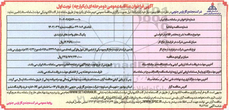 شرکت مجتمع گاز پارس جنوبی در نظر دارد اقلام مورد نیاز خود را با شرایط ذیل بصورت برگزاری مناقصه عمومی دو مرحله ای یکپارچه از طریق سامانه تدارکات الکترونیکی دولت سامانه ستاد تامین نماید.