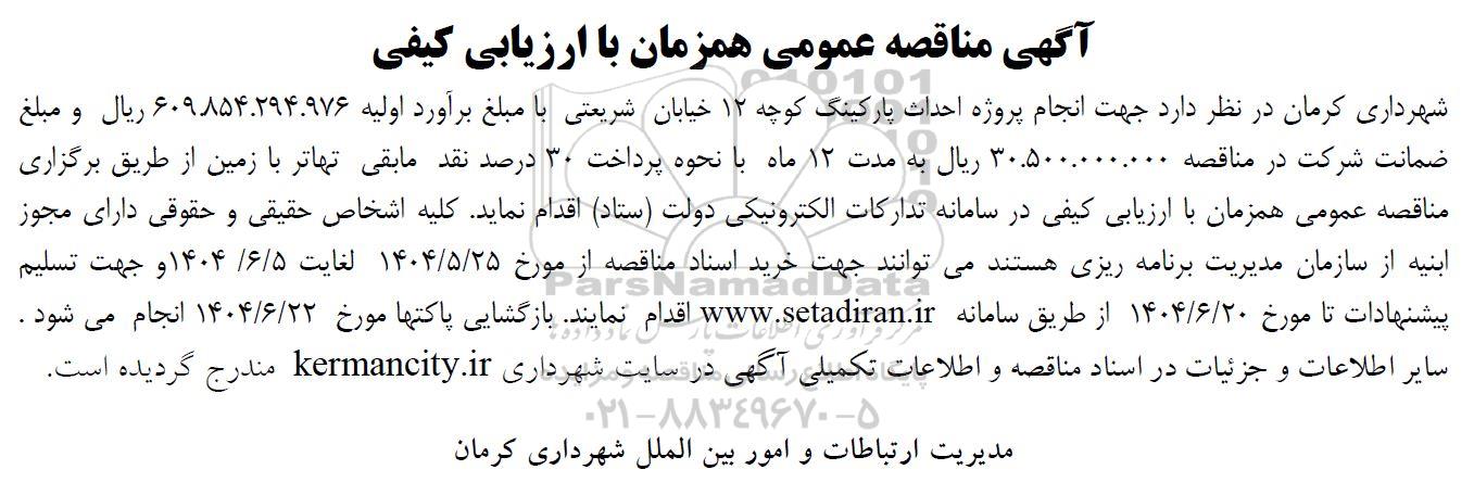 شهرداری کرمان در نظر دارد جهت انجام پروژه احداث پارکینگ کوچه 12 خیابان شریعتی با مبلغ برآورد اولیه 609.854.294.976 ریال و مبلغ ضمانت شرکت در مناقصه 30.500.000 ریال به مدت 12 ماه با نحوه پرداخت 30 درصد نقد مابقی تهاتر با زمین از طریق برگزاری مناقصه عمومی همزمان با ارزیابی کیفی در سامانه تدارکات الکترونیکی دولت (ستاد) اقدام نماید کلیه اشخاص حقیقی و حقوقی دارای مجوز ابنیه از سازمان مدیریت برنامه ریزی هستند میتوانند جهت خرید اسناد مناقصه از مورخ 1404.5.25 لغایت 1404.6.5 و جهت تسلیم پیشنهادات تا مورخ 1404.6.20 از طریق سامانه ستاد ایران اقدام نمایند بازگشایی پاکتها مورخ 1404.6.22 انجام میشود .