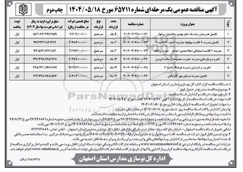 | 6 | تکمیل مدرسه مسکن مهر گلپایگان | 2004004038000076 | 12 ماه | 8.383.000.000 | 167.648.178.517 |