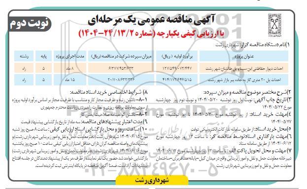 مناقصه احداث دیوار حفاظتی ابن سینا و پل طالشان .... نوبت دوم از کلیه افراد متخصص و شرکتها واجد شرایط دعوت به عمل میآید در مناقصه با کد خبرگزاری پارس نماد: 9404856 شرکت نمایند.