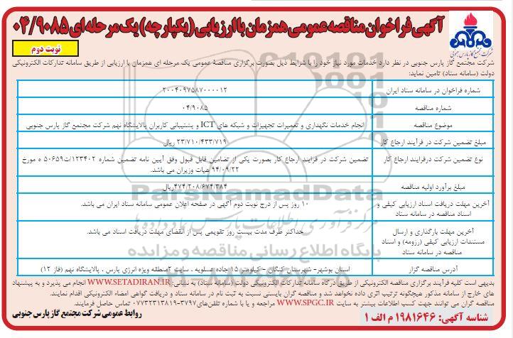 موضوع مناقصه: انجام خدمات نگهداری و تعمیرات و شبکه های ICT و پشتیبانی کاربران پالایشگاه نهم شرکت مجتمع گاز پارس جنوبی
