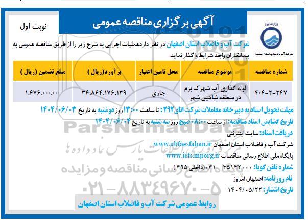 شرکت آب و فاضلاب استان اصفهان در نظر دارد عملیات اجرایی به شرح زیر را از طریق مناقصه عمومی به پیمانکاران واجد شرایط واگذار نماید.