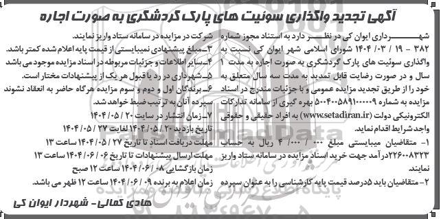 شهرداری ایوان کی در نظر دارد به استناد مجوز شماره 382 - 19.1404.03 شورای اسلامی شهر ایوان کی نسبت به واگذاری سوئیت های پارک گردشگری به صورت اجاره به مدت 1 سال و در صورت رضایت قابل تمدید به مدت سه سال متعلق به خود را از طریق تجدید مزایده عمومی و با جزئیات مندرج در اسناد مزایده به شماره 5004005891000009 بهره گیری از سامانه تدارکات الکترونیکی دولت سایت ستاد ایران به افراد حقیقی و حقوقی واجد شرایط اقدام نماید.