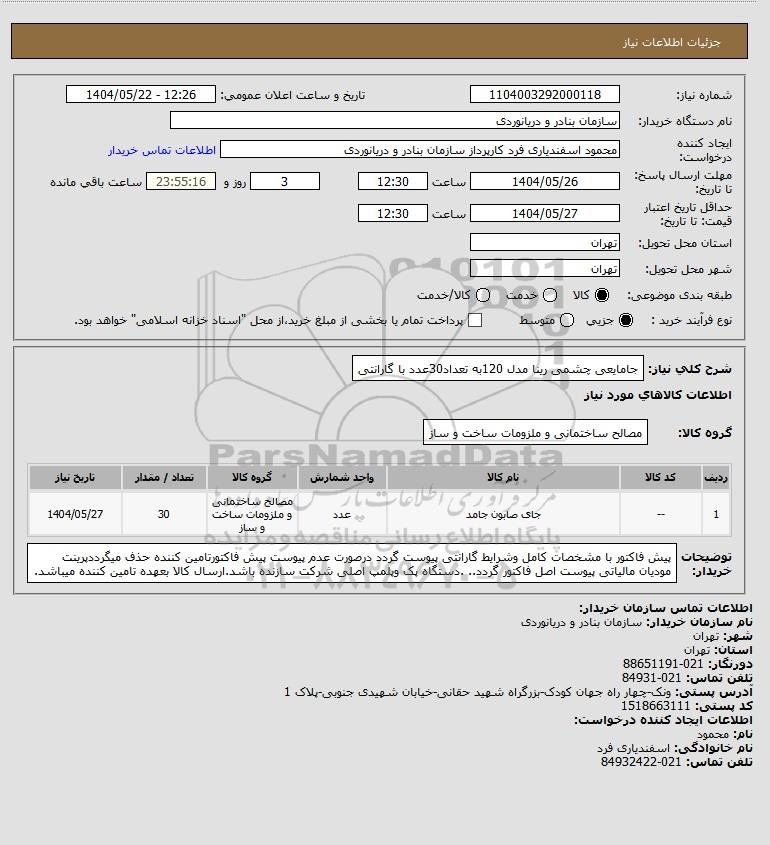 شرح کلی نیاز: جامایعی چشمی رینا مدل 120به تعداد30عدد با گارانتی