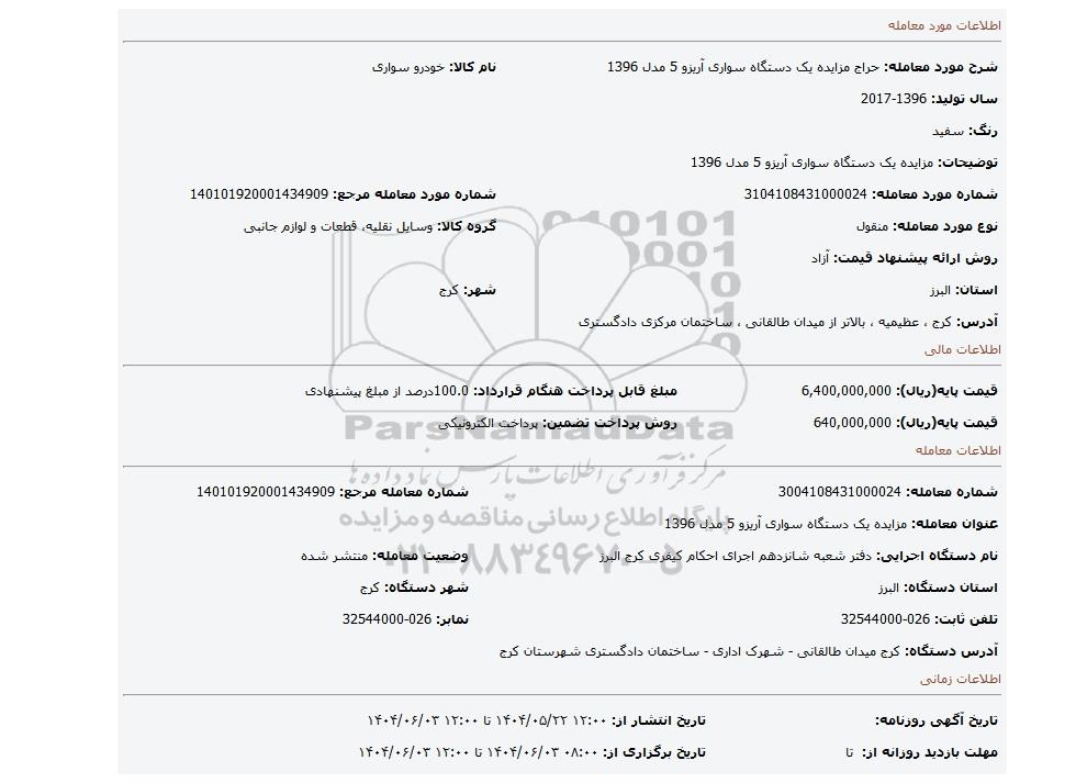 مزایده، مزایده یک دستگاه سواری آریزو 5 مدل 1396