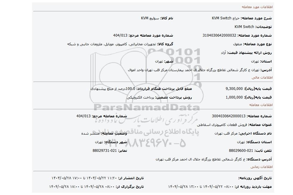 | نام دستگاه اجرایی: مرکز قلب تهران | وضعیت معامله: منتشر شده | |
