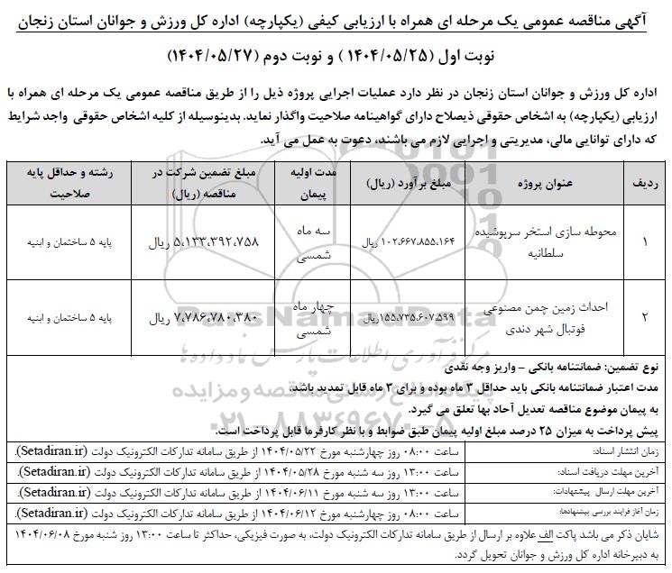 اداره کل ورزش و جوانان استان زنجان در نظر دارد عملیات اجرایی پروژه ذیل را از طریق مناقصه عمومی یک مرحله ای همراه با ارزیابی (یکپارچه) به اشخاص حقوقی و حقیقی ذیصلاح و دارای گواهینامه صلاحیت واگذار نماید. بدینوسیله از کلیه اشخاص حقوقی و حقیقی واجد شرایط که دارای توانایی مالی، مدیریتی و اجرایی لازم میباشند دعوت به عمل می آید.