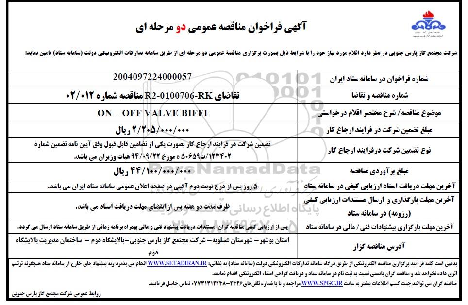 فراخوان مناقصه ON - OFF VALVE BIFFI از کلیه افراد متخصص و شرکتها واجد شرایط دعوت به عمل میآید در مناقصه با کد خبرگزاری پارس نماد: 9405572 شرکت نمایند.