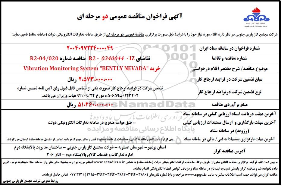 فراخوان مناقصه خرید Vibration Monitoring System BENTLY NEVADA, فراخوان مناقصه خرید Vibration Monitoring System BENTLY NEVADA
