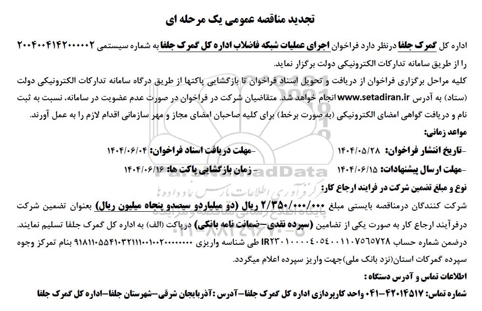 اداره کل گمرک جلفا در نظر دارد فراخوان اجرای عملیات شبکه فاضلاب اداره کل گمرک جلفا به شماره سیستمی 2004004142000002 را از طریق سامانه تدارکات الکترونیکی دولت برگزار نماید.