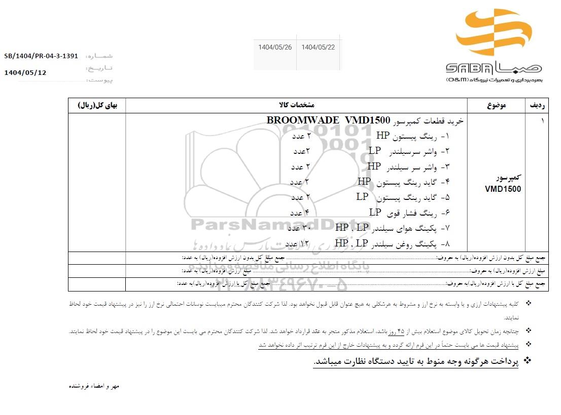 استعلام بها و موضوع استعلام استعلام خرید قطعات کمپرسور broomwade vmd1500 به اطلاع کلیه شرکت‌ها و افراد متخصص واجد شرایط می‌رساند، آگهی گذار در نظر دارد از طریق استعلام بها، نسبت به انتخاب و دریافت پیشنهادات اقدام نماید. این استعلام با کد آگهی ثبت شده در سامانه خبرگزاری پارس نماد : 9405700 منتشر شده است. مشخصات استعلام : تاریخ شروع استعلام: 1404/05/22 آخرین مهلت ارسال پیشنهاد قیمت : 1404/05/26 و محل اجرای پروژه : استان سایر میباشد. استعلام قیمت مورد درخواست : استعلام خرید قطعات کمپرسور broomwade vmd1500 با دسته‌بندی‌های تخصصی و گروه های مرتبط : قطعات لاستیکی, کمپرسورهای هوا, لوله و اتصالات, نیروگاه, تجهیزات برق و الکترونیک, استعلام اطلاع رسانی میگردد. شرایط شرکت در استعلام آنلاین : ابتدا ثبت نام در سامانه استعلام پارس نماد و تکمیل مدارک موردنیاز و بارگذاری در سامانه رعایت تمامی ضوابط و الزامات مندرج در اسناد استعلام است.