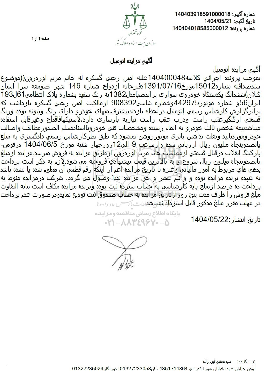 مزایده فروش یک دستگاه خودرو سواری پراید صبا مدل 1382