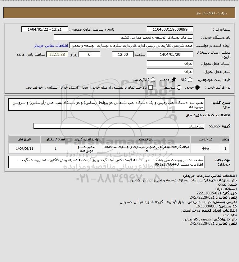 شرح کلی نیاز: نصب سه دستگاه پمپ زمینی و یک دستگاه پمپ بشقابی دو پروانه(ابرسانی) و دو دستگاه پمپ جتی (آبرسانی) و سرویس موتورخانه