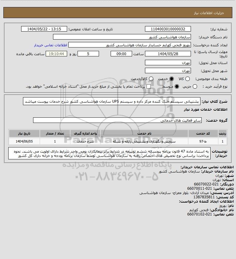 شرح کلی نیاز: پشتیبانی سیستم خنک کننده مرکز داده و سیستم UPS سازمان هواشناسی کشور