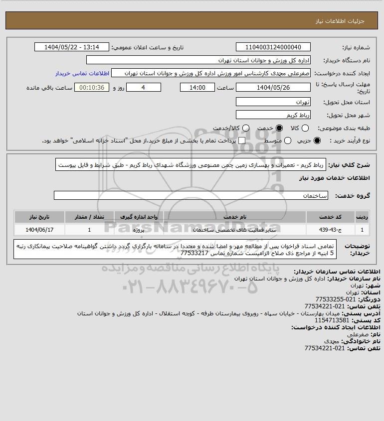 شرح کلی نیاز: رباط کریم - تعمیرات و بهسازی زمین چمن مصنوعی ورزشگاه شهدای رباط کریم - طبق شرایط و فایل پیوست