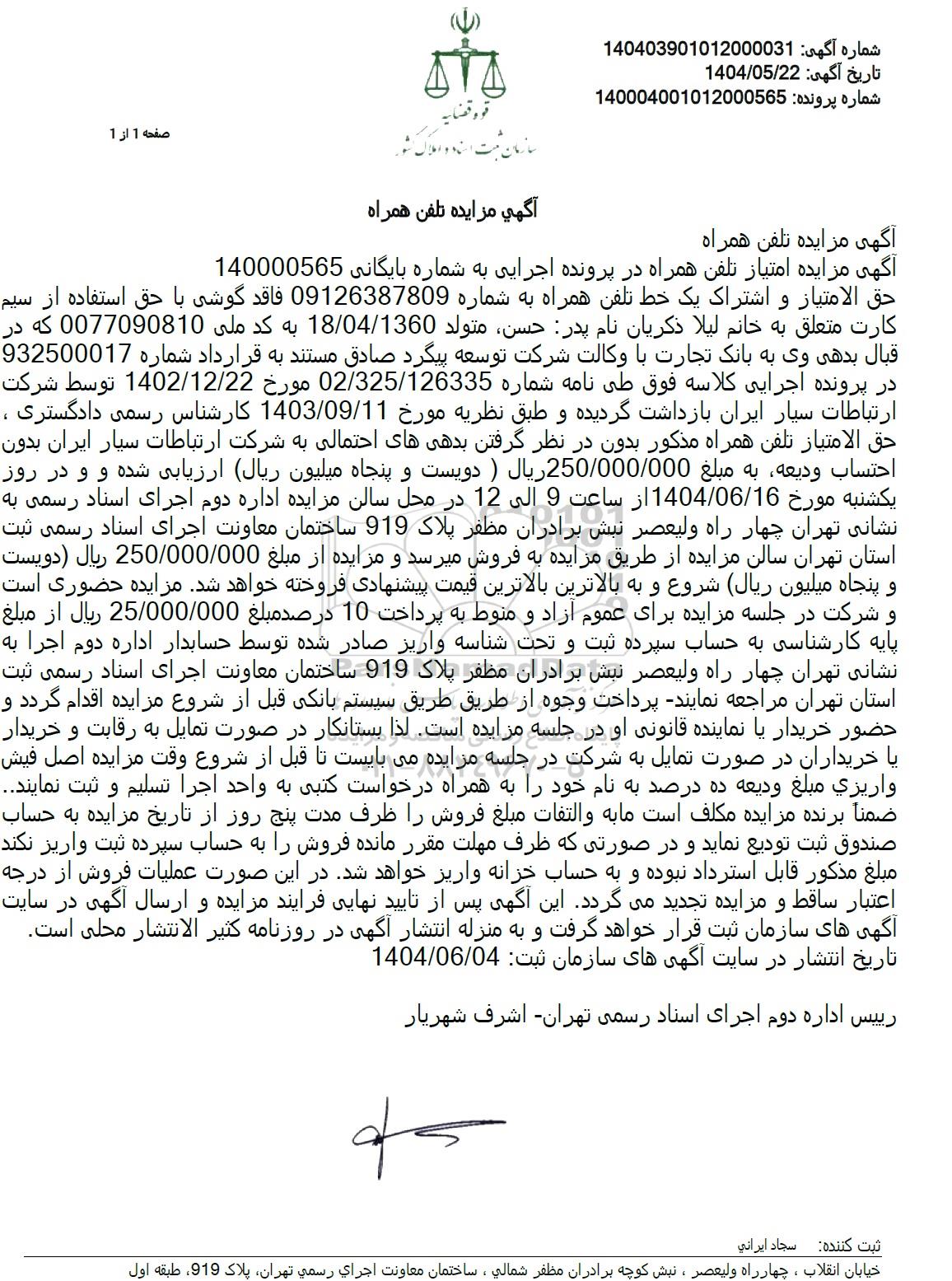مزایده فروش تلفن همراه به شماره 09126387809 به مبلغ 250.000.000 ریال