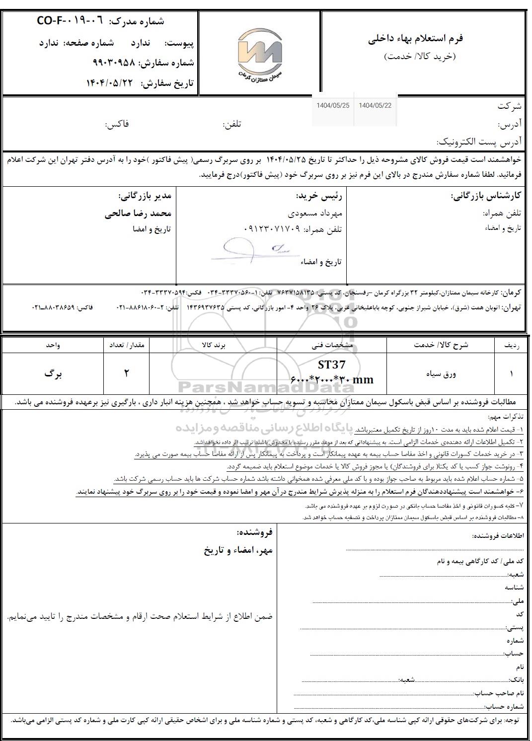 خواهشمند است قیمت فروش کالای مشروحه ذیل را حداکثر تا تاریخ 1404.5.25 بر روی سربرگ رسمی پیش فاکتور خود را به ادرس دفتر تهران این شرکت اعلام فرمایید . لطفا شماره سفارش مندرج در بالای این فرم نیز بر روی سربرگ خود (پیش فاکتور) درج فرمایید
