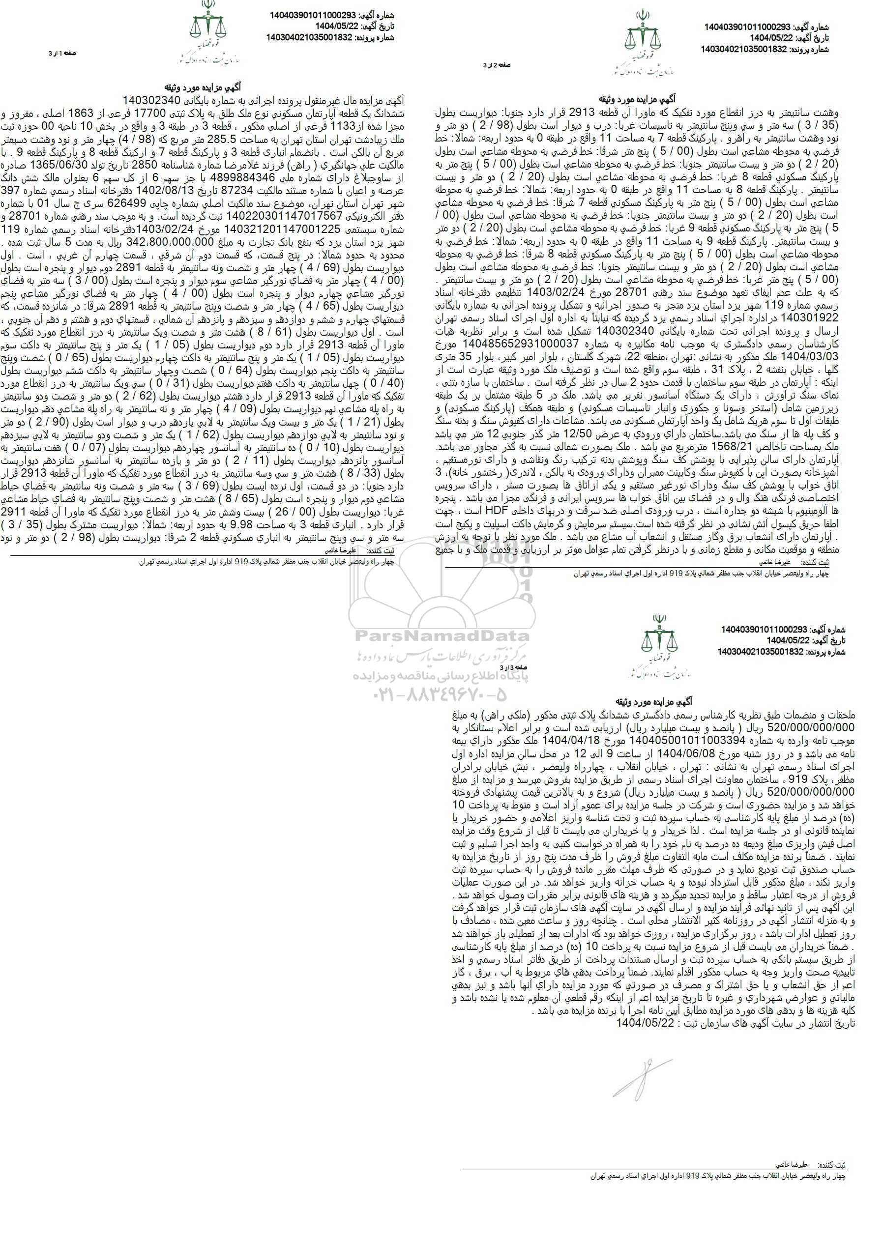 موضوع مزایده : یک قطعه آپارتمان مسکونی تحت پلاک ثبتی 17700 فرعی از 1863 اصلی، مفروز و مجزی شده از 1133 فرعی از اصلی مذکور به ارزش 520.000.000.000 ریال