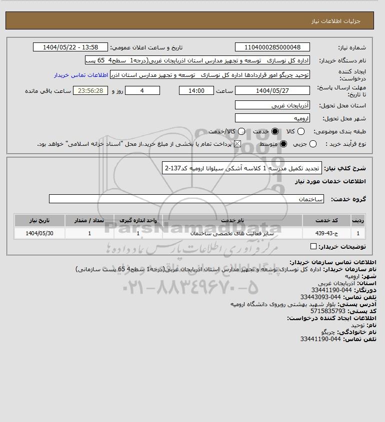 شرح کلی نیاز: تجدید تکمیل مدرسه 1 کلاسه آشکی سیلوانا ارومیه کد137-2