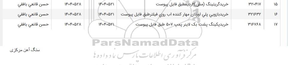 | 316768 | خرید پیکنگ پشت بک لاینر پمپ 507 طبق فایل پیوست | 1404.5.21 | 1404.5.28 | حسن قانعی بافقی |