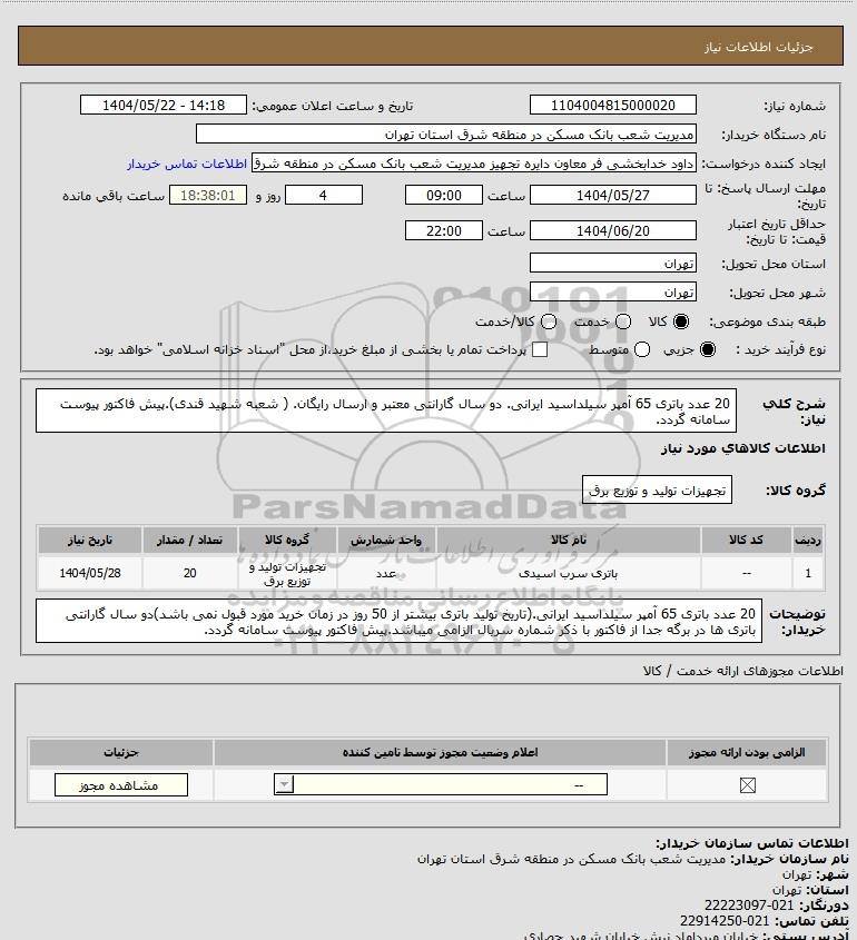 شرح کلی نیاز: 20 عدد باتری 65 آمپر سیلداسید ایرانی. دو سال گارانتی معتبر و ارسال رایگان. ( شعبه شهید قندی).پیش فاکتور پیوست سامانه گردد.