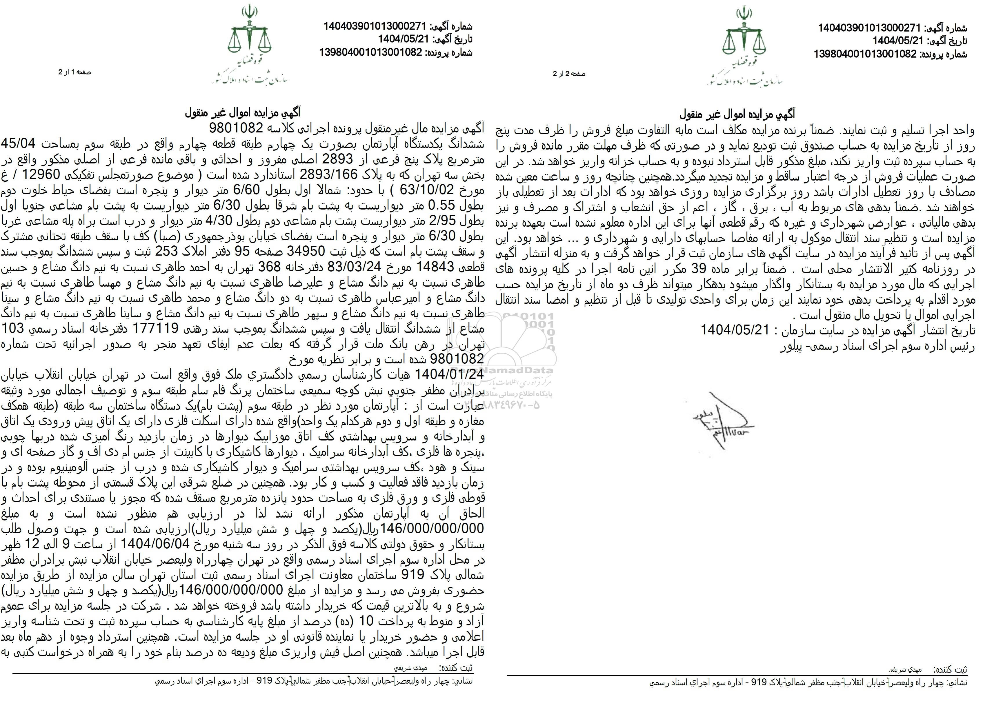 موضوع مزایده : یک دستگاه آپارتمان در طبقه سوم به مساحت 45/04 مترمربع تحت پلاک ثبتی فرعی از 2893 اصلی مفروز و مجزی شده به ارزش 146.000.000.000 ریال