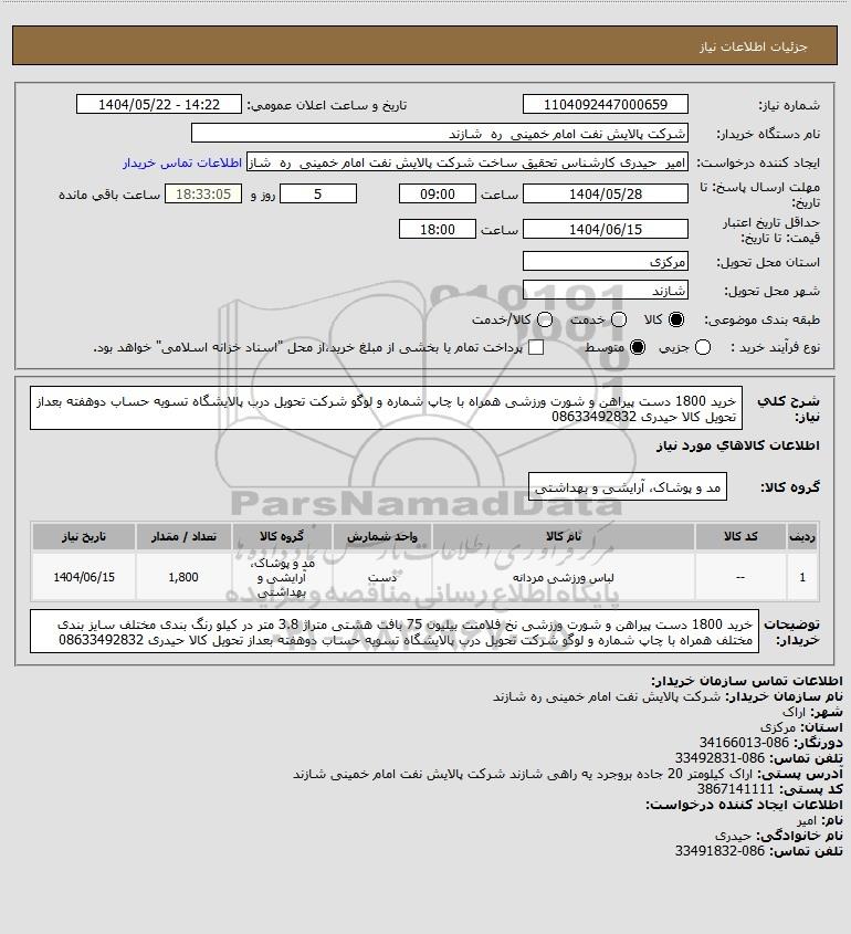 استعلام خرید 1800 دست پیراهن و شورت ورزشی همراه با چاپ شماره و لوگو شرکت تحویل درب پالایشگاه تسویه حساب دوهفته بعداز تحویل کالا حیدری 08633492832, استعلام خرید 1800 دست پیراهن و شورت ورزشی همراه با چاپ شماره و لوگو شرکت تحویل درب پالایشگاه تسویه حساب دوهفته بعداز تحویل کالا حیدری 08633492832