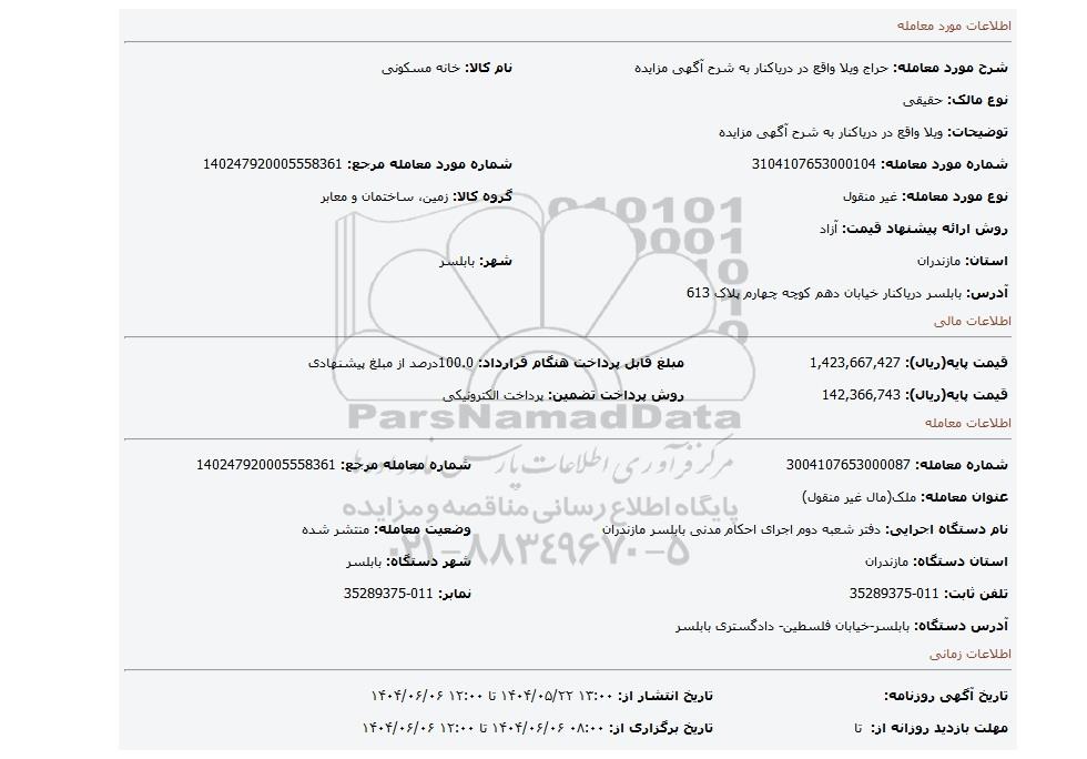 | شرح مورد معامله: حراج ویلا واقع در دریاکنار به شرح آگهی مزایده | نام کالا: خانه مسکونی | |