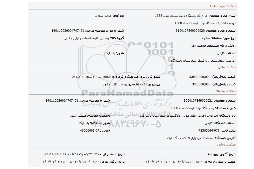 | توضیحات: یک دستگاه وانت نیسان مدل 1388 | ||