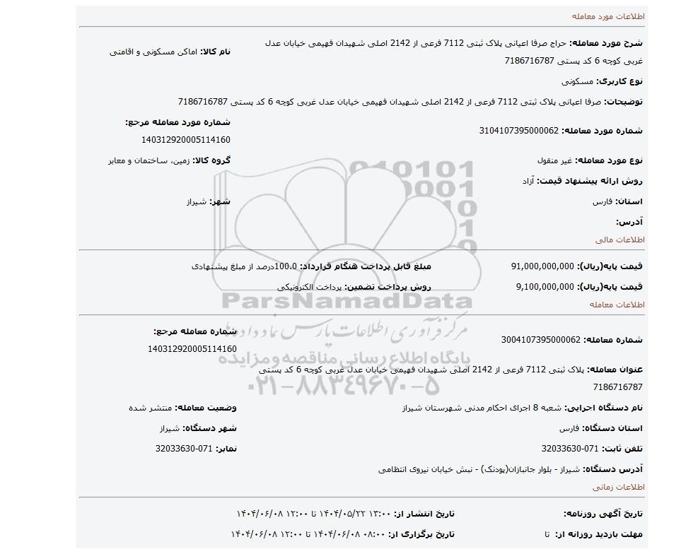 مزایده عمومی مزایده صرفا اعیانی پلاک ثبتی 7112 فرعی از 2142 اصلی شهیدان فهیمی خیابان عدل غربی کوچه 6 کد پستی 7186716787 برگزار میگردد. از کلیه افراد متخصص و شرکتهای واجد شرایط دعوت به عمل میآید تا در این مزایده با کد خبرگزاری پارس نماد : 9406069 شرکت نمایند تاریخ شروع مزایده : 1404/05/22 مهلت شرکت در مزایده: تا پایان روز 1404/06/08 مکان برگزاری اموال واگذاری استانهای فارس و دستهبندیهای مربوط به این حراجی املاک و زمین میباشد.