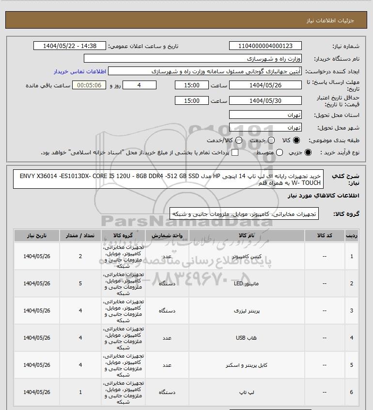 | 6 | -- | لپ تاپ | دستگاه | تجهیزات مخابراتی، کامپیوتر، موبایل، ملزومات جانبی و شبکه | 1 | 1404/05/26 |