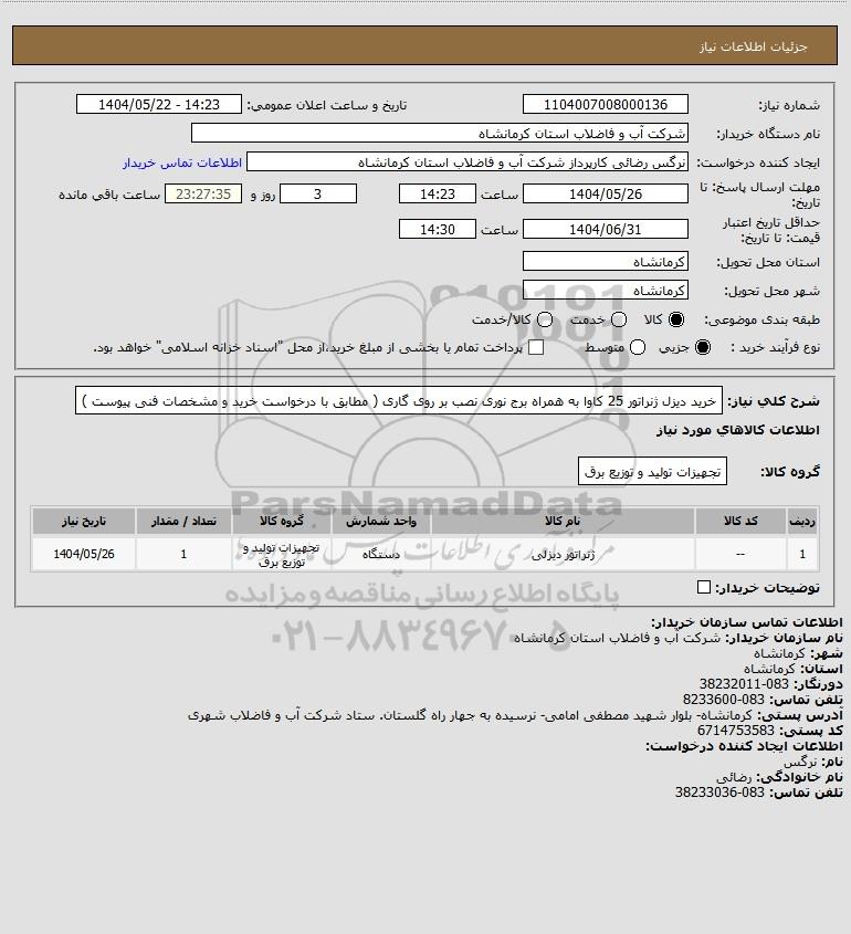 شرح کلی نیاز: خرید دیزل ژنراتور 25 کاوا به همراه برج نوری نصب بر روی گاری ( مطابق با درخواست خرید و مشخصات فنی پیوست )