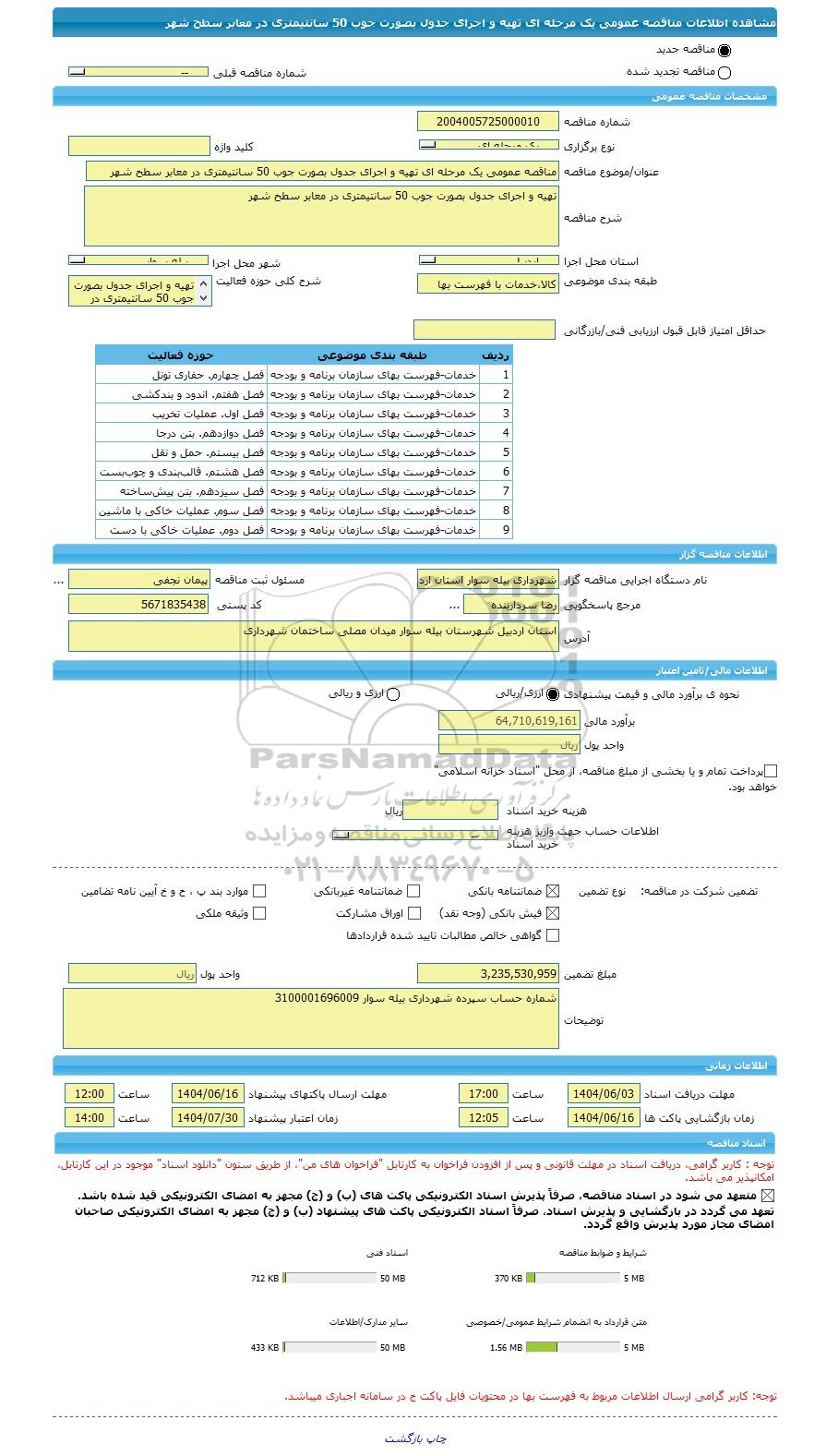 مناقصه مناقصه عمومی یک مرحله ای تهیه و اجرای جدول بصورت جوب 50 سانتیمتری در معابر سطح شهر از کلیه افراد متخصص و شرکتها واجد شرایط دعوت به عمل میآید در مناقصه با کد خبرگزاری پارس نماد: 9406568 شرکت نمایند.