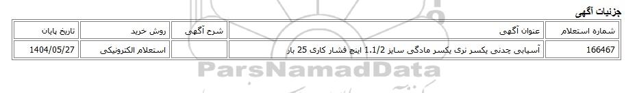 | 166467 | آسیابی چدنی یکسر نری یکسر مادگی سایز 1.1/2 اینچ فشار کاری 25 بار | استعلام الکترونیکی | 1404/05/27 |