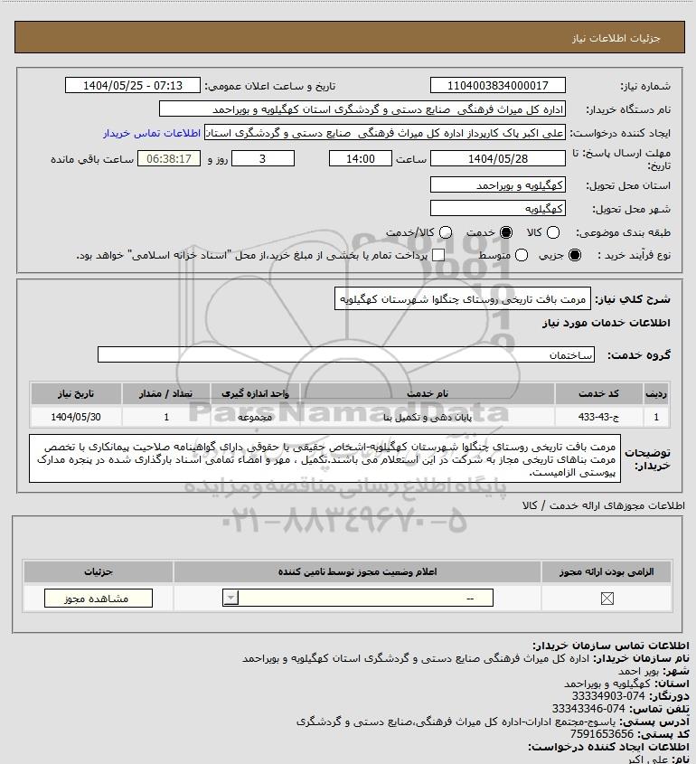 شرح کلی نیاز: مرمت بافت تاریخی روستای چنگلوا شهرستان کهگیلویه